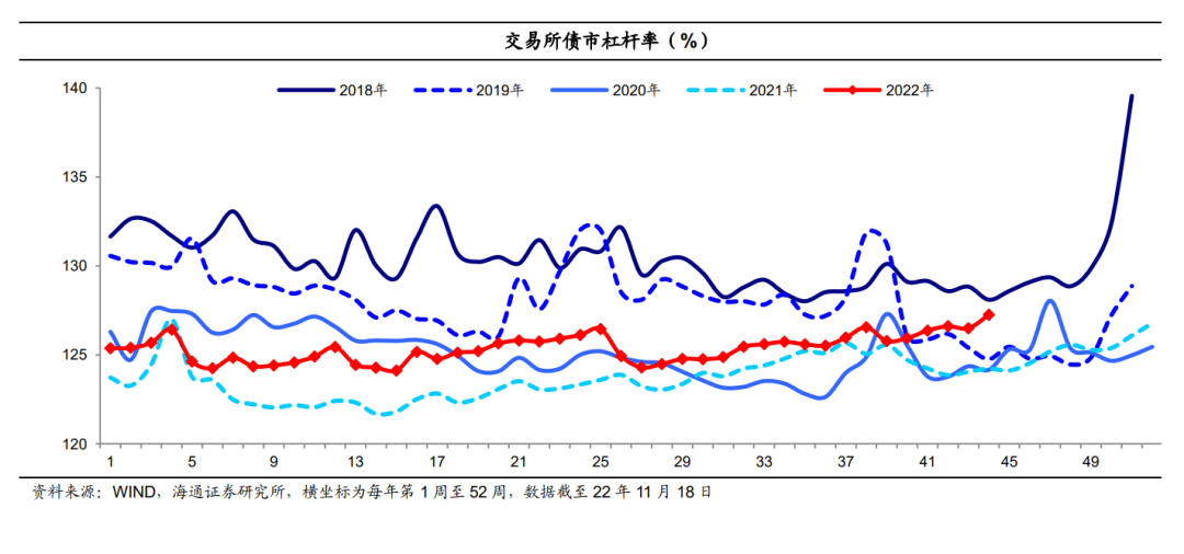 (7)交易所债市杠杆率反弹、创年内新高。至11月18日当周交易所债市杠杆率为127.3%,环比转为上行0.8个百分点、同比继续上行3.1个百分点。