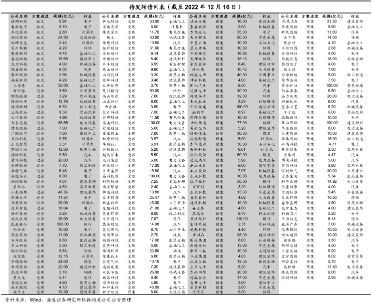 截至2022年12月16日,待发新券共3564.16亿元,共205只(待发转债详见附表2)。其中批文+过会的转债463.16亿元,共38只。