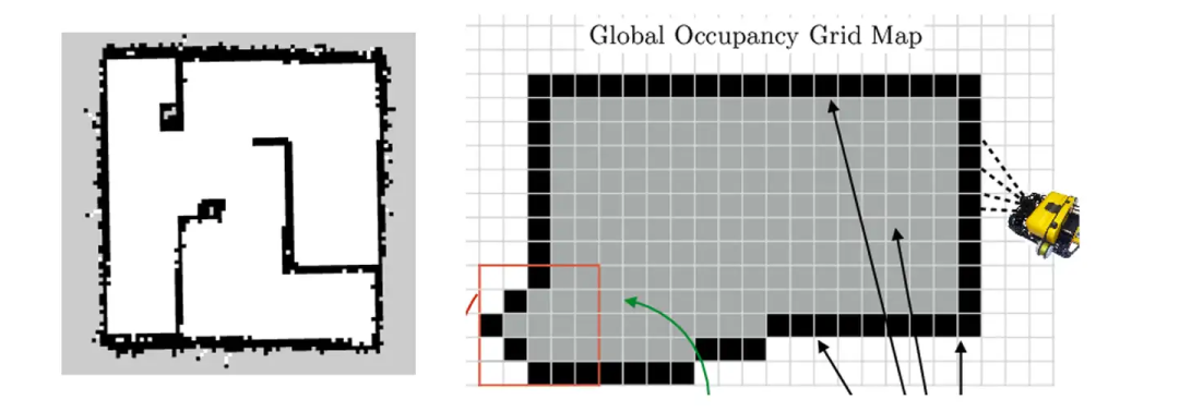 栅格地图(Grid Map)将空间划分为均匀的网格,每个网格存储一个值,表征地图的属性。一种常见的方式,用三种状态:占用、空闲、未知,表示某个栅格是否被占用,这种表达方式称作“占用栅格地图”(Occupancy Grid Map),机器人导航常用栅格地图,在“空闲”栅格中规划运动轨迹。一般来说,栅格地图指的是二维平面地图。