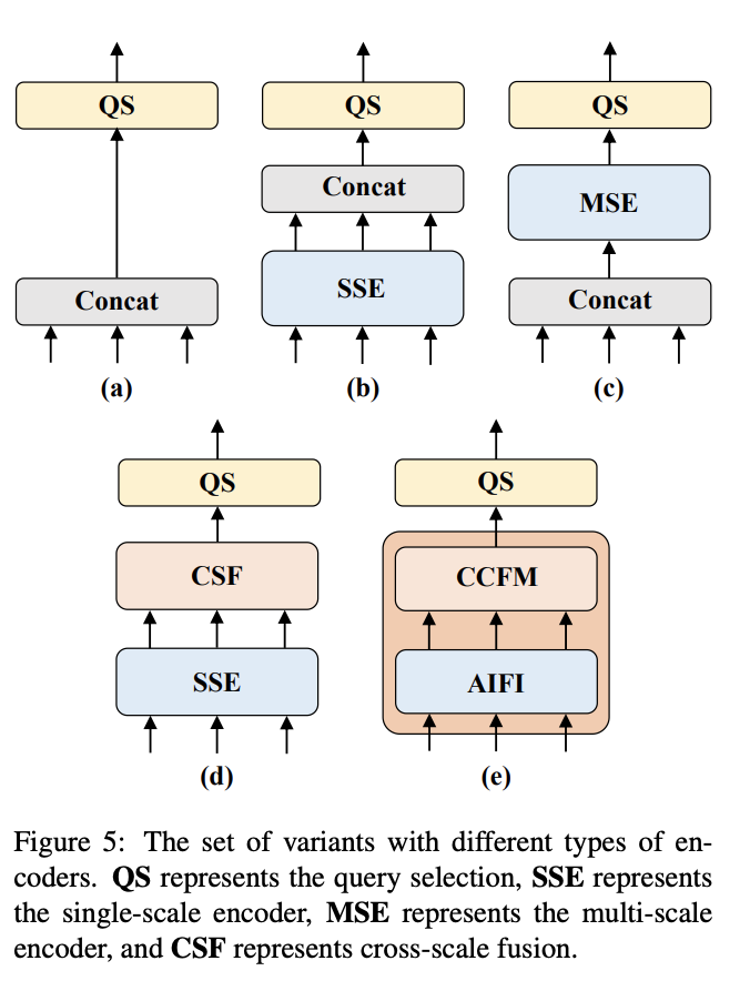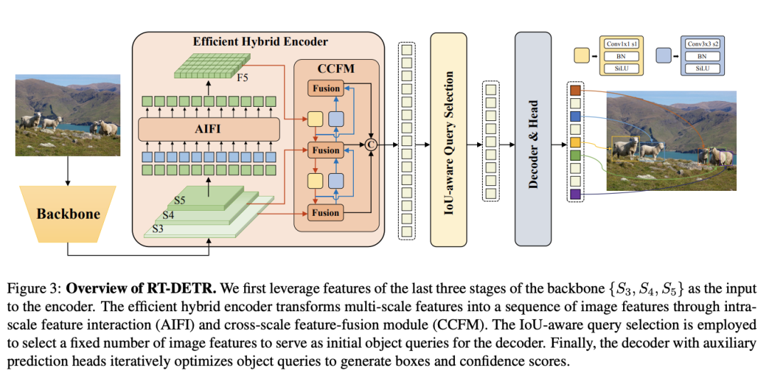 (2) Neck: 起名为HybridEncoder,其实是相当于DETR中的Encoder,其也类似于经典检测模型模型常用的FPN,论文里分析了Encoder计算量是比较冗余的,作者解耦了基于Transformer的这种全局特征编码,设计了AIFI (尺度内特征交互)和 CCFM(跨尺度特征融合)结合的新的高效混合编码器也就是 Efficient Hybrid Encoder ,此外把encoder_layer层数由6减小到1层,并且由几个通道维度区分L和X两个版本,配合CCFM中RepBlock数量一起调节宽度深度实现Scaled RT-DETR;