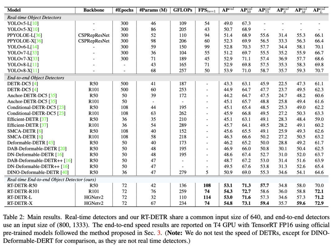 DETR类在COCO上常用的尺度都是800x1333,以往都是以Res50 backbone刷上45 mAP甚至50 mAP为目标,而RT-DETR在采用了YOLO风格的640x640尺度情况下,也不需要熬时长训几百个epoch 就能轻松突破50mAP,精度也远高于所有DETR类模型。此外值得注意的是,RT-DETR只需要300个queries,设置更大比如像DINO的900个肯定还会更高,但是应该会变慢很多意义不大。