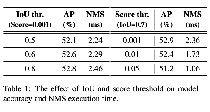 论文其实并没有一开始就介绍模型方法,而是通过NMS分析来引出主题。针对NMS的2个超参数得分阈值和IoU阈值,作者不仅分析了不同得分阈值过滤后的剩余预测框数,也分析了不同NMS超参数下精度和NMS执行时间,结论是NMS其实非常敏感,如果真的实际应用,不仅调参麻烦而且精度速度波动很大。以往YOLO论文中都会比一个纯模型去NMS后的速度FPS之类的,其实也很容易发现各大YOLO的NMS参数不一,而且真实应用的时候都得加上NMS才能出精确的检测框结果,所以端到端的FPS和论文公布的FPS(纯模型)不是一回事,明显会更慢的多,可以说是虚假的实时性。