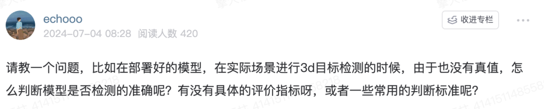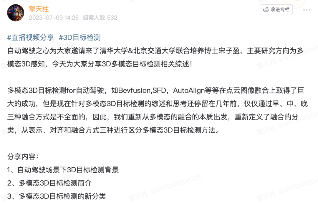3D检测作为自动驾驶领域发展很久的方向,已经相对成熟,衍生出很多的算法适合云端和车端。那么3D检测到底涉及哪些内容呢?今天就带大家一起看下我们『自动驾驶之心知识星球』关于3D目标检测的相关内容和前沿讨论!涉及综述/数据集/前沿算法的汇总、科研界顶级大佬直播、岗位招聘、日常讨论、从业感悟等等,应有尽有~