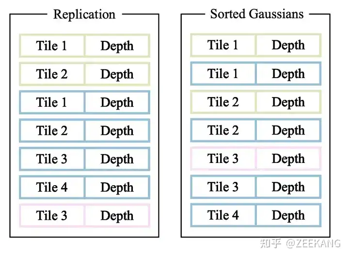 考虑到每个3D Gaussian投影到2D image时可能会投影到多个tile,处理方法是如果一个Gaussian投影与多个tile相交,就实例化多次Gaussian,每个Gaussian instance都会得到一个结合view space depth和tile ID得到的key。然后基于这些key,使用single fast GPU Radix sort进行排序。