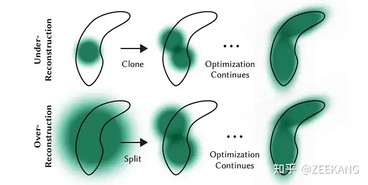 densify简单来说就是,under-reconstructed区域克隆small Gaussians以及在high-variance(我觉得就是Over-reconstructed)区域分离large Gaussian。