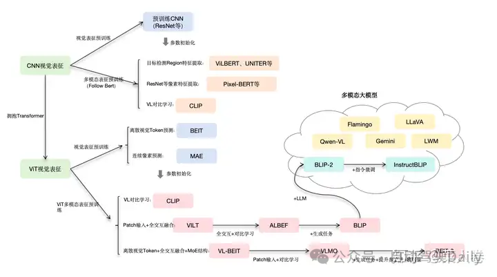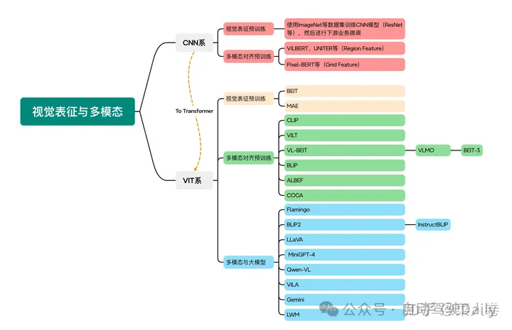 对于视觉表征,从发展上可以分为卷积神经网络(CNN)和Vision Transformer(VIT)两大脉络,二者分别都有各自的表征、预训练以及多模态对齐的发展过程。而对于VIT线,另有多模态大模型如火如荼的发展,可谓日新月异。