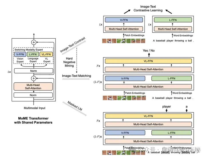VLMO是VL-BEIT的同期工作,如图20。VLMO相较于VL-BEIT的不同之处在于:1、舍弃了视觉侧的Visual Token ID预测,简化了整体的网络结构;2、增加了类似CLIP的图文对比学习任务,以及交互型的图文匹配任务。虽然VLMO相对于VL-BEIT在效果上并不出彩,但为后续BEIT-3的工作奠定了基础。网络结构上,VLMO是VL-BEIT都使用MoME Transformer结构,对不同的模态使用不同的Expert头,以区分不同模态的表征。