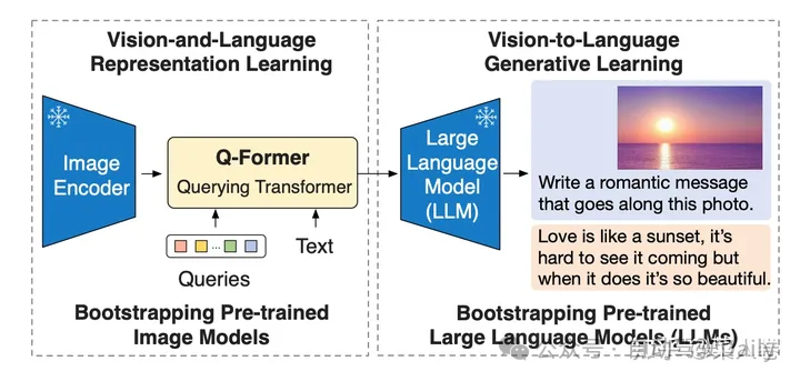 BLIP-2的论文标题是Bootstrapping Language-Image Pre-training with Frozen Image Encoders and Large Language Models,核心思路是通过利用预训练好的视觉模型和语言模型来提升多模态效果和降低训练成本。