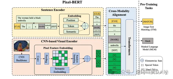 此外,Pixel-BERT使用随机像素采样机制来增强视觉表示的鲁棒性,并使用MLM和ITM作为预训练任务进行预训练。最后通过对下游任务进行广泛的实验,在包括视觉问答(VQA)、图像文本检索和视觉推理等下游任务中取得了SOTA效果。