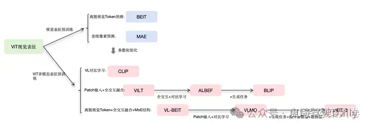 以VIT为基础的视觉预训练可以通过Transformers对视觉进行有效表征,这种方法也逐渐成为目前视觉信息编码的主流手段。以此为延伸,基于此的多模态预训练工作也层出不穷,也为如今的多模态大模型的顺理成章打下了坚实基础。