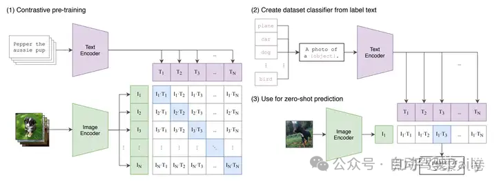 CLIP的核心思路是通过对比学习的方法进行视觉和自然语言表征的对齐。如图xx(1),CLIP首先分别对文本和图像进行特征抽取,文本的Encoder为预训练BERT,视觉侧的Encoder可以使用传统的CNN模型,也可是VIT系列模型。得到图文表征向量后,在对特征进行标准化(Normalize)后计算Batch内图文Pair对之间的余弦距离,通过Triple Loss或InfoNCELoss等目标函数拉近正样本对之间的距离,同时使负样本对的距离拉远。