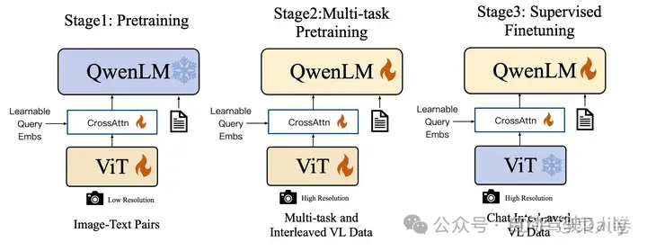 如图33,Qwen-VL的训练过程分为三个阶段: