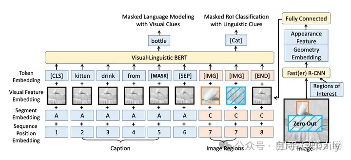 另一个Region Feature Base的经典工作是VL-BERT。如图7,与LXMERT不同的是,VL-BERT属于单路输入模式,视觉特征在经过目标检测模型进行Region特征提取后,直接和文本Embedding一起拼接输入到Transformer网络中进行多模态的交叉Attention。