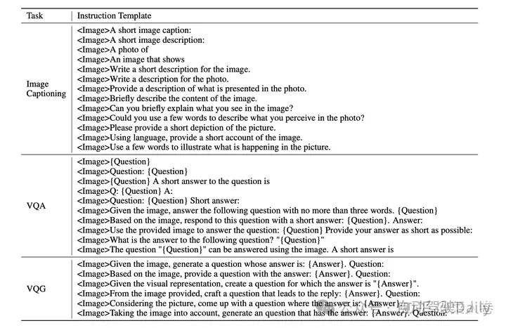 对应的,InstructBLIP的另一个不同是训练数据也使用指令形式,将各种类型任务的开源学术数据,使用模板构造成指令多模态数据。数据模板如图31。