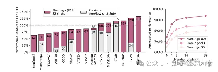 最后Flamingo在各种多模态任务上的效果也非常优秀,甚至在有些数据集上通过few-shot方式可以超过经典模型的SOTA。