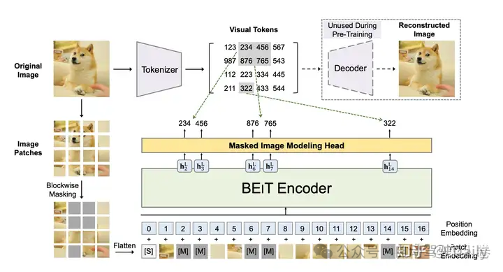 另一类Transformer视觉模型预训练的代表范式是BEIT(BERT Pre-Training of Image Transformers)模型。为了与BERT的预训练框架对齐,BEIT通过辅助网络模块先对视觉Patch进行Tokenizer,得到整张图各部分的视觉Token ID。然后将视觉Patch视为自然语言中的单词进行掩码预测,完成预训练流程。