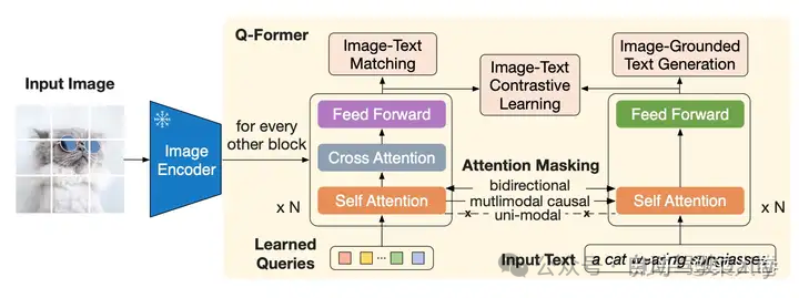 上面提到,为了避免灾难遗忘,BLIP-2冻结了ViT和LLM的参数,只训练Q-Former模块。为了训练更加稳定,Q-Former模块的训练包括两个阶段。