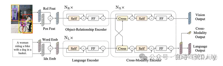 LXMERT是早期进行多模态特征融合的工作之一,如图6,模型采用经典的两路深层表征输入结构。在视觉侧关注单图,图像经过目标检测模型得到区域块的特征序列,又经过Transformer做进一步编码区域块之间的关系(Object-Relationship Encoder);文本侧通过BERT结构得到文本的特征序列(Language Encoder),最后两者使用深层Transformer结构做交叉Attention,最后进行多任务的预训练。LXMERT的预训练任务相比BERT较多,包括Masked图像特征的预测、图像Label的预测(猫、狗等)、VQA、图文是否匹配以及纯文本侧的Masked语言模型(MLM)。