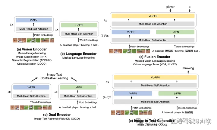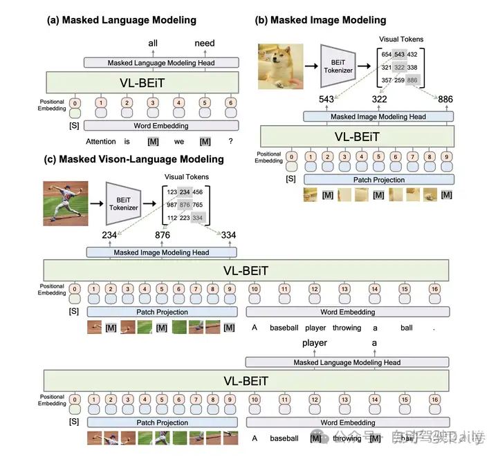 VL-BEIT可以看作是前文提到的BEIT在多模态对齐预训练工作的延续,同时借鉴了ViLT的网络结构。如图19,与ViLT的区别在于,VL-BEIT期望将单模态和多模态统一到一个模型中,在预训练任务设计上,同时考虑了纯文本、纯视觉以及图文多模态任务。纯文本任务为MLM(a);纯视觉特征的MIM,其中MIM的目标是BEIT工作中的Visual Token ID(b);图文多模态任务包括考虑文本特征的视觉Token预测,以及考虑视觉特征的文本Token预测(c)。