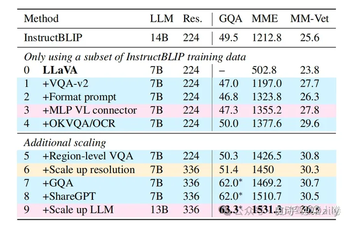 LLaVA1.5模型的效果在一些评测数据集上相比Qwen-VL有更好的效果,说明通过一些优化工作,使用更少的数据,更简单的Adapter结构,也能使LLM具备不错的多模态理解能力。在数据层面,如图35,对比LLaVA1.5和LLaVA工作,通过增加高质量细粒度的VL数据、丰富指令、纯文本指令微调数据、提升图片输入像素、提升LLM参数规模等手段,可以有效提升模型效果。