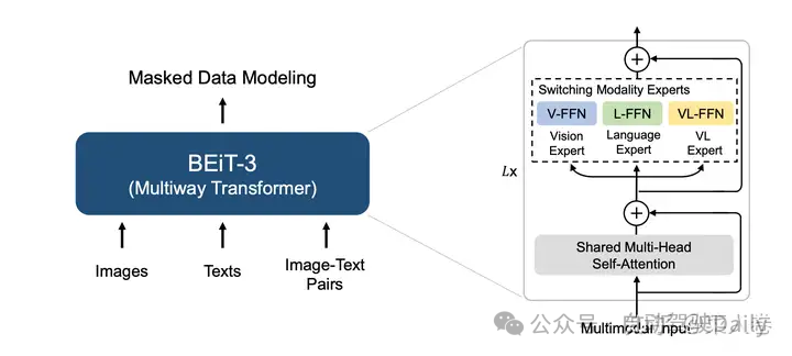 与VLMO网络结构类似,BEIT-3将图像、文本和图文多模态输入统一到一个单独的Multiway Transformer网络。不同于经典的Transformer,BEIT-3使用一个多类型输入共享的多头自注意力模块(Multi-Head Self-Attention),不同类型的模态输入各有一个全连接专家模块单独学习。如图21,视觉模态使用V-FFN、文本模态对应L-FFN,图文多模态输入对应VL-FFN,模型会根据不同类型的模态输入选择不同的模块生效。