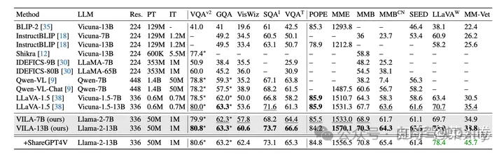 VILA是较新的工作,因此有更丰富的模型效果对比,如图38,相对各时期的SoTA,VILA在公开评测指标上有不错的效果。