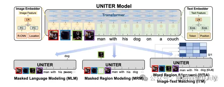 如图8,UNITER使用和VL-BERT类似的架构,同样的单路架构,同样是目标检测模型做视觉的语义特征抽取,并进一步使用更多的训练数据、更多的预训练任务,希望得到一个更加通用的图文多模态表征模型。UNITER通过在四个图像和文本数据集(COCO, Visual Genome, Conceptual Captions, and SBU Captions)上进行大规模的预训练,可以支持多种视觉和语言任务的联合多模态表征。同时设计了四种预训练任务:遮蔽语言建模(MLM),遮蔽区域建模(MRM,有三种变体),图像-文本匹配(ITM),和词-区域对齐(WRA)。