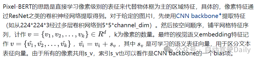 Pixel-BERT是Grid Feature Based多模态融合代表工作之一。如图9,与Region Feature Based方法不同的是,Pixel-BERT不需要使用目标检测模型进行ROI区域的特征抽取,而是直接通过卷积网络提取图片的像素级别特征,直觉和文本特征一起输入到下游的Transformer网络进行特征融合。这种方式减少了目标检测区域框标注的成本,同时缓解了视觉语义label与文本语义的不均衡问题(区域框的物体类别往往上千规模,而文本可以表达的语义远不止于此)。