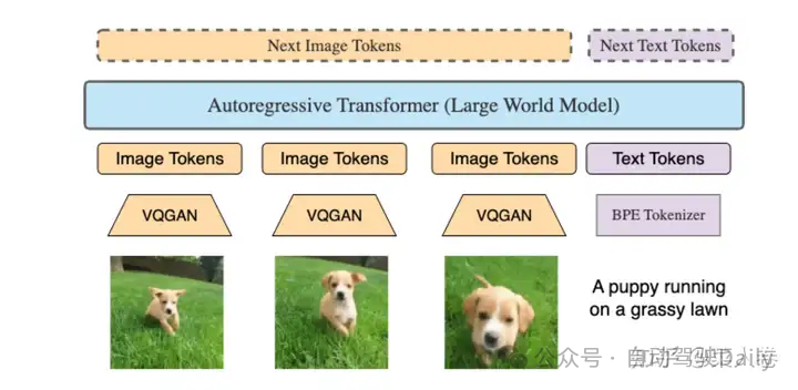 与之前大多数方法不同的是,视觉的编码器使用VQGAN,可以将256 × 256输入图片编码成16 × 16 离散Token。这使得LWM不仅可以生成文本,也可以基于文本生成Image Token还原成视频。对于多图或视频帧,可以分别做视觉特征抽取,和文本模态一起输入到LLM中。