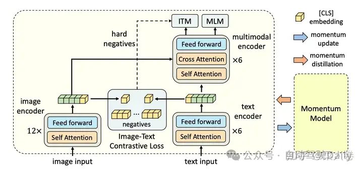 最后,由于ALBEF的预训练数据多数为互联网中挖掘的图文对,天然存在较大的噪声数据。为了缓解这个问题,ALBEF在训练过程中通过一个动量自蒸馏的模块(一个移动平均版本的ALBEF模型),生成训练数据集的伪标签,用来辅助模型的训练。