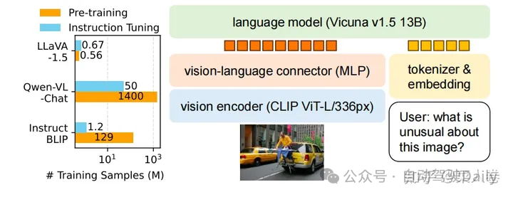 另一个与LLaVA比较类似,但有所补充的工作是英伟达的VILA(不是显卡)。VILA模型的网络结构和LLaVA十分类似,我们不做过多赘述。不同的是VILA通过实验,总结了多模态预训练的一些经验,其中有些经验在相关工作中也有所体现,主要为以下三点: