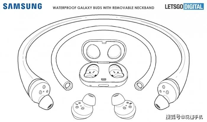 从专利图来看,专利中的耳塞与现有的「三星Galaxy Buds+」产品十分相似,耳塞拥有内置麦克风、传感器和一个双向扬声器,还包括一个类似于Galaxy Buds+触摸板。特别的是,这款耳塞还配有一个额外的颈圈附件,与耳机组装使用后类似于“颈戴耳机”,能够让耳机在水下使用。