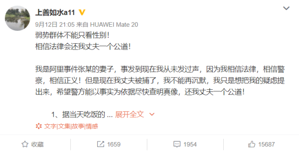 9月12日,微博认证为“阿里女员工被侵害案张某妻子”的用户@上善如水a11 发声。