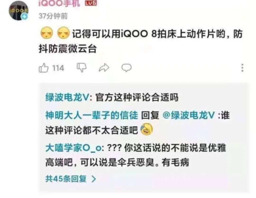 但令人遗憾的是在这次宣传的过程中,iQOO的B站运营团队却不幸翻车了,8月30日晚上在某UP主的视频评论区,突然出现了一条iQOO手机官方账号的不当言论(如上图),眼看着不当言论一发不可收拾,iQOO手机官方也在事发当晚发表了致歉声明,向UP主本人以及B站网友诚恳道歉。