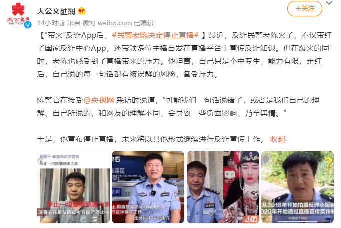 于是,民警老陈选择了停止直播,表示未来会以其他形式继续进行反诈宣传工作。