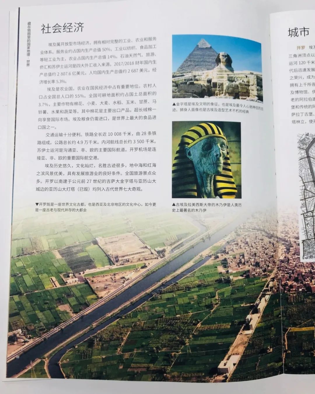 我相信你们更没有看到过,除非像我那些师兄师姐专门从事地理科学研究和遥感影像的。《藏在地图里的国家地理·世界》是一套地理大百科,一共4大本。亚洲、欧洲、北美洲南美洲、非洲大洋洲4个主题,包括了世界六大洲中148个国家地区,106个城市。里面有自然地理、社会人文、社会经济、城市特色等等等。涉及到的知识实在是太强大了,而且体系特别成熟,非常系统。特别适合小学、初中生、高中生、大学生以及成年人去阅读。不要认为这是给孩子的书,99%的内容你都不会。(那句话叫什么来着,不服来战,哈哈哈…)我学了6年的地理,四年本科加两年研究生,教了8年的高中地理课,里面有太多的知识震撼到我,大大拓宽了我的地理视野。不仅地理知识详尽,《藏在地图中的国家地理 · 世界》还同步高中地理必修教材。火山与地震,自然界的水循环,经线纬线,山脉的形成,地表形态的塑造……这是我们高中地理课堂必须学的。而这些,在《藏在地图中的国家地理 · 世界》都用极其精彩震撼的方式,呈现出来了。有趣的是,它不仅跟高中教材同步,我手里也有初中教材,其实他跟初中教材也高度同步。这套书与初高中教材高度同步,从专业的角度来说,特别实用。孩子们课堂上听不懂的内容,课下还可以翻翻这套震撼的大书。有图有画面感,许多抽象的知识,就好懂很多。但是我有时候希望一套书,我们不只看到在考试上有多实用,更要看到它在扩大孩子的视野,培养孩子的阅读兴趣,丰富孩子读书的多元化角度。这是非洲的马达加斯加,所有的孩子知道它都是因为动画片儿,觉得马达加斯加有企鹅。然而高中地理老师告诉你,马达加斯加并没有天然的企鹅。(如果有,也是被人抓过去的。)结合着图片,我给我家娃蛋蛋,讲解了火山爆发,岩浆涌出,冷却凝固,塑造成火山的整个过程。你看,在书里山两侧的自然带分布,垂直带谱差异,雪线的高度,山脉的成因,全都一目了然,标识的非常清晰。翻到这的时候,我给蛋蛋讲了木乃伊的制作过程,为什么会长成这个样子,我问“哈哈,怕不怕?”蛋蛋说一点都不可怕。(得,我就不应该问。)