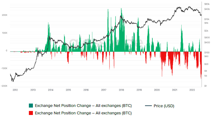 衡量比特币金额的30天交易所净头寸变化,在中心化交易所,2022年6月出现了有记录以来最大的资金流出,表明持有人正在将其代币从交易所和中心化借贷中转移出平台。这表明投资者可能对中心化管理的基金持谨慎态度于风险较高的策略,可能面临流动性问题的贷款人使用用户资金。相反,用户似乎在被动地选择持有他们的数字资产。