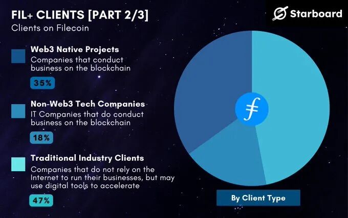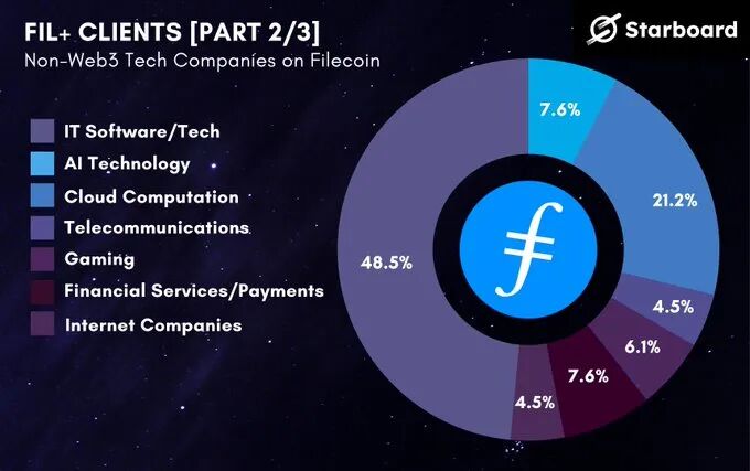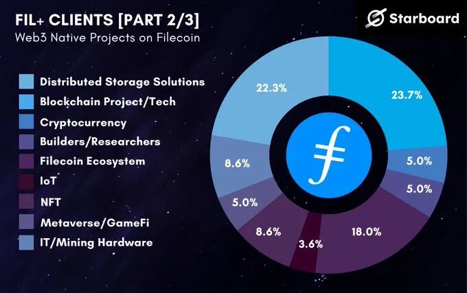 2/ Filecoin #Web3的大部分客户来自区块链项目/科技公司。借助 Filecoin 的数据互操作性,其 Web3 客户端中约 15% 与#NFTs和#Metaverse相关,两者都高度依赖分散存储来保护关键数字和数据资产。