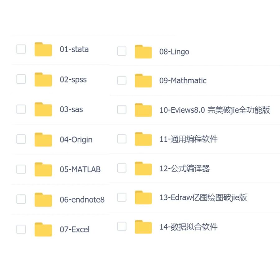 Stata/Spss/Sas;MathMatic/Matlab/MathType/Lingo;Datafit/Edraw/Origin;Endnote等海量软件资源,你能想到的,我们都有!让你无论是清洗、筛选数据,回归分析,还是建模,作图等拥有神之利器