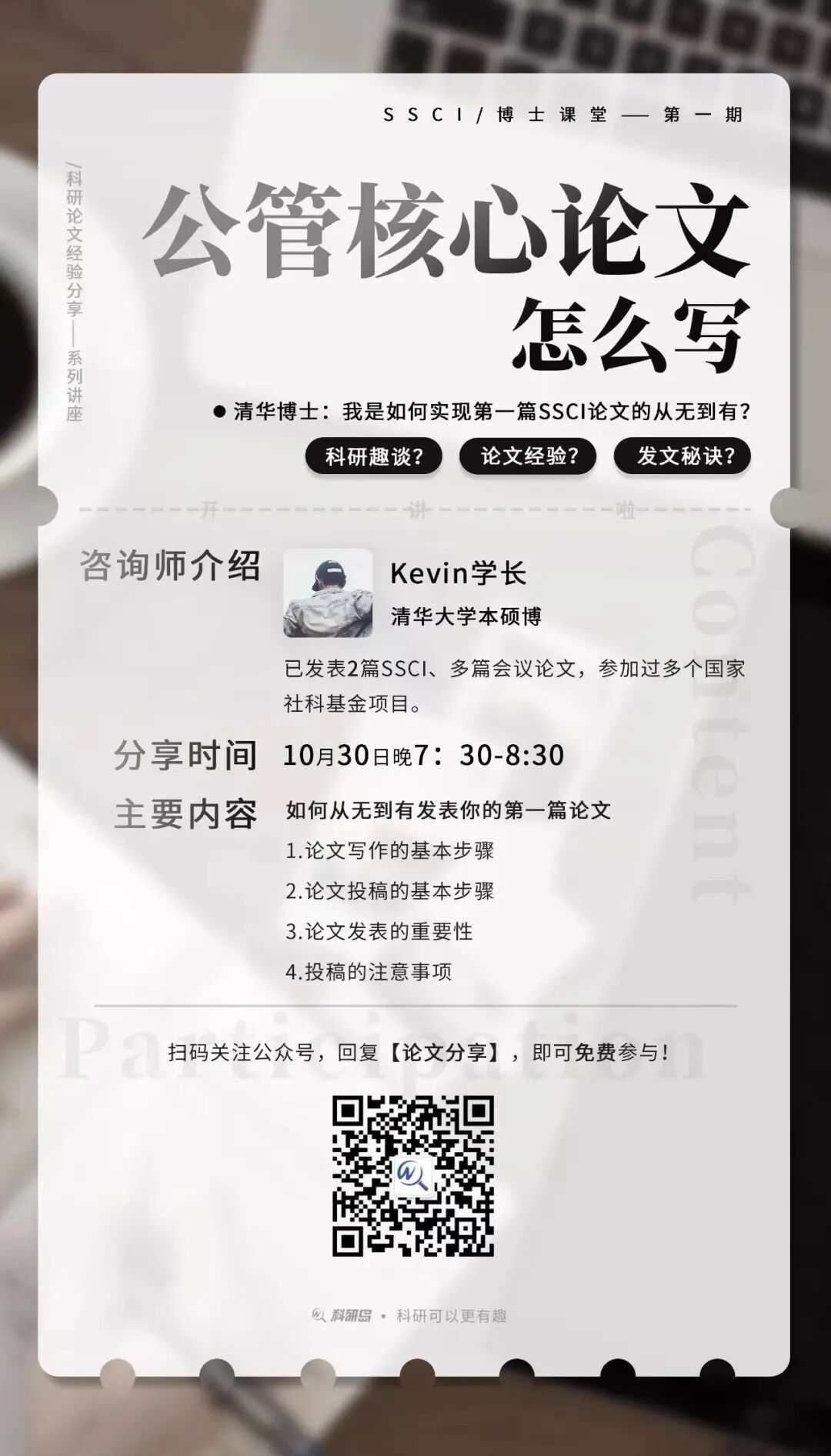 为了帮助大家提高论文产出效率,小科在前段时间邀请到了Kevin学长(清华大学公管博士生,本硕博),分享自己的发文秘诀,帮助大家了解如何从无到有发表自己的第一篇论文!今天小科将博士公管核心论文专题讲座视频资料整理好分享给大家,错过活动直播或者想在课后温习一下的同学们可以免费领取学习!