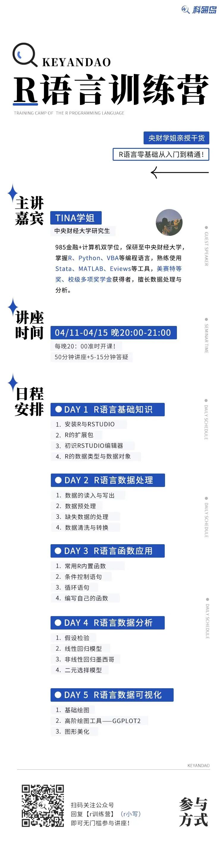为了帮助大家速成R语言,小科邀请了TINA学姐(985金融+计算机双学位,中央财经大学研究生),亲授干货!带你5天零基础速成R语言!今天小科将整理好R语言训练营视频资料分享给大家,错过活动直播或者想在课后温习一下的同学们可以免费领取学习!