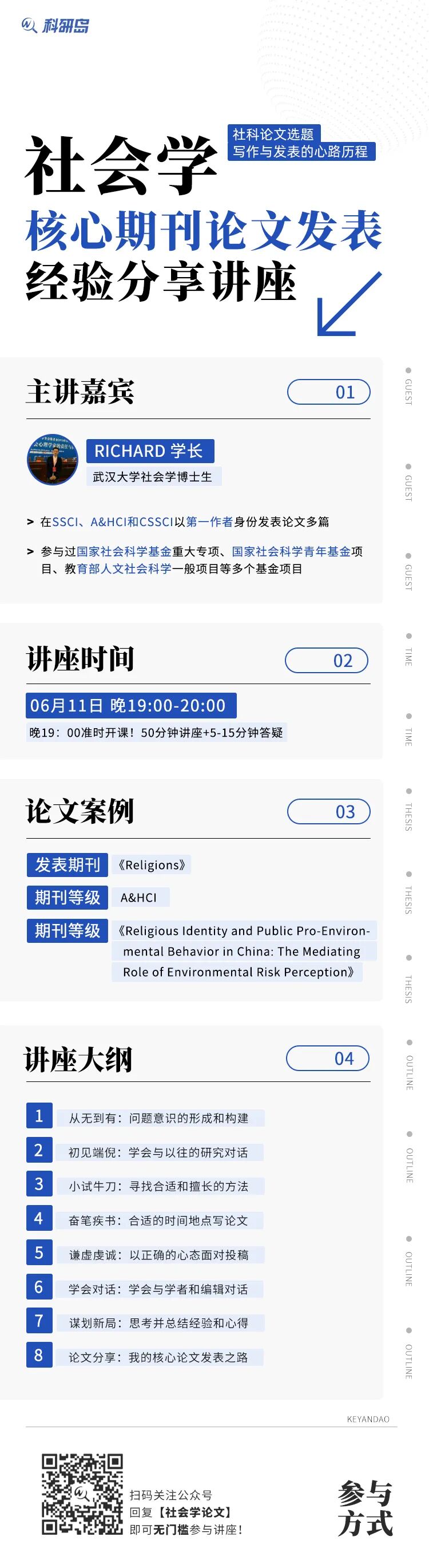 小科为了帮助各位社科学子更好地发表论文,特地邀请了Richard学长(武汉大学社会学博士生),给大家分享社会学核心期刊论文发表经验,帮助大家解决社会学论文写作发表过程中遇到的各种疑难杂症,同时助力大家发表高水平论文!今天小科将整理好的社会学核心论文写作视频资料分享给大家,错过活动直播或者想在课后温习一下的同学们可以免费领取学习!