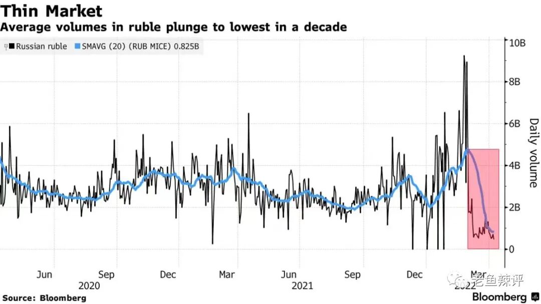 虽然卢布现在的汇率看着好像挺高,但成交量却创了2012年以来的历史新低,一方面是市场对卢布的信心严重不足,另一方面也说明买卖卢布很难操作。