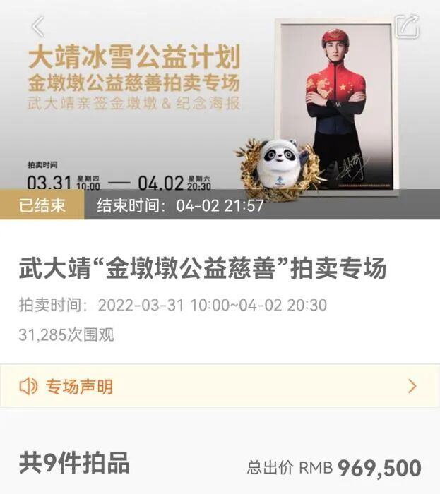拍卖页面介绍,金墩墩上有武大靖签名以及“2022.2.5”的日期。据称,武大靖还将在这个金墩墩玩偶上加签“to 中标人姓名”字样。该专场拍卖于3月31日在线上开启。被拍卖的金墩墩为2月5日武大靖和队友勇夺首金,为中国冬奥代表团取得开门红时的冬奥冠军“伴手礼”。中新财经记者注意到,开拍仅1小时后,金墩墩叫价已达1.7万元,当晚竞价至17万元,4月1日已有买家出价到30万元。4月2日晚临近截拍时,多位买家参与竞价。出价记录显示,叫价从30余万元一路上涨至92万元,金墩墩最终被匿名账号拍下。除此之外,同场拍卖的8幅武大靖亲笔签名海报均以高于5000元的价格落槌。其中落槌价最高的一幅达9500元。据悉,这8幅海报每幅都带有独立编号,武大靖还会分别写上8句祝福。拍卖页面显示,该专场9件拍品总出价达到96.95万元。另据此前报道,在本场慈善拍卖结束后,所筹善款将直接捐赠至大靖冰雪公益计划。除了本次的拍卖所得,武大靖个人还将额外向大靖冰雪公益计划捐款10万元人民币。