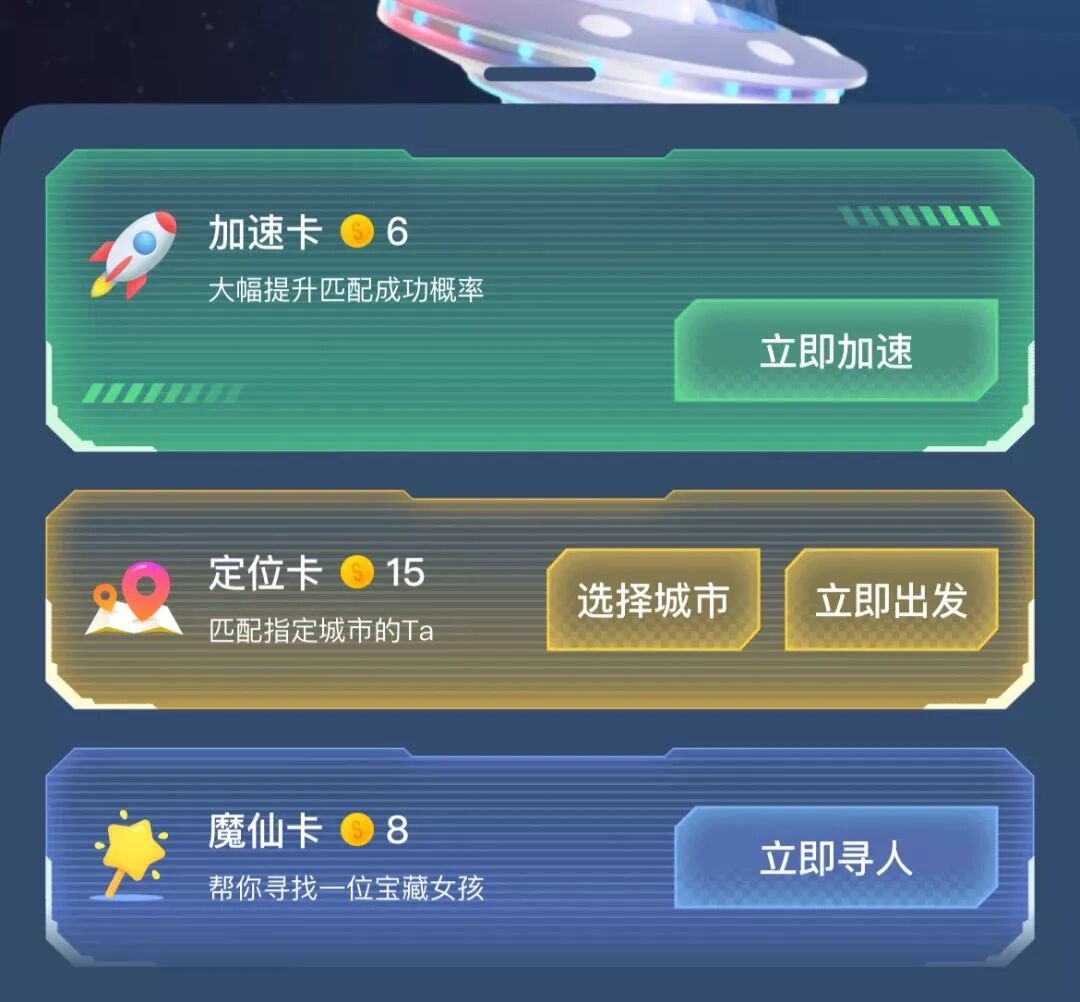 Soul的社区氛围,也更鼓励一种速食社交。比如,不知道从什么时候开始,匹配界面添加了一个加速匹配的按钮。这是一个付费功能。匹配有了次数限制,语音匹配每天只有三次是免费的,普通的灵魂匹配,免费额度30次。超额匹配,指定性别、指定城市的匹配,都需要额外付费。