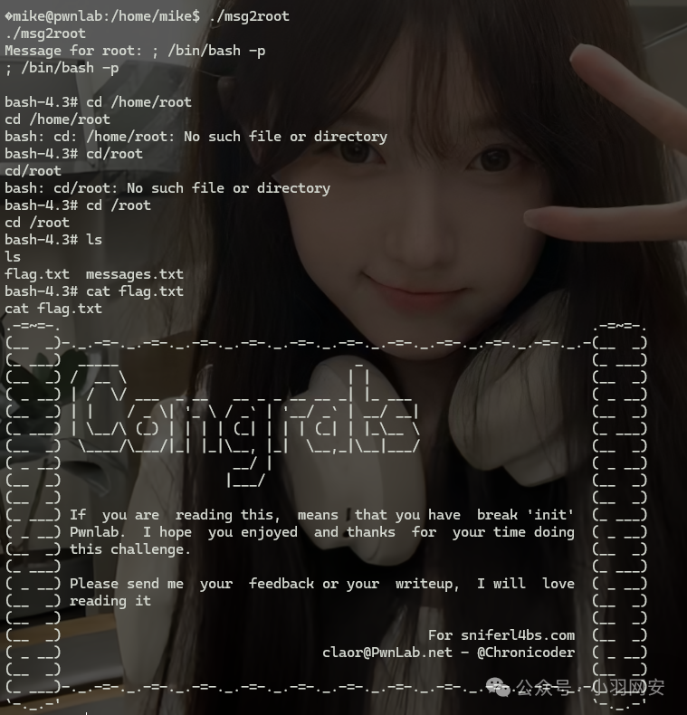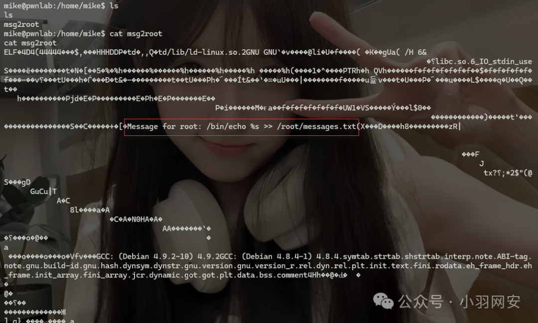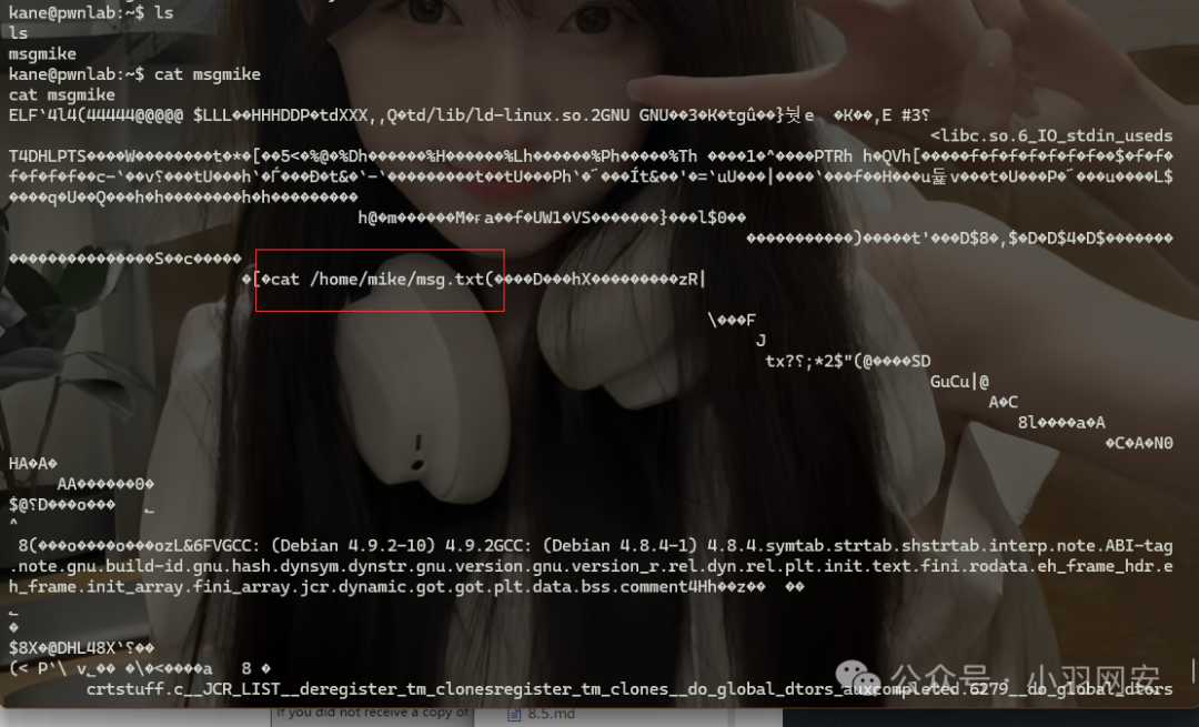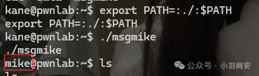 这样当我们再次运行./msgmike命令的时候,就会触发当前目录下的cat(/bin/sh),