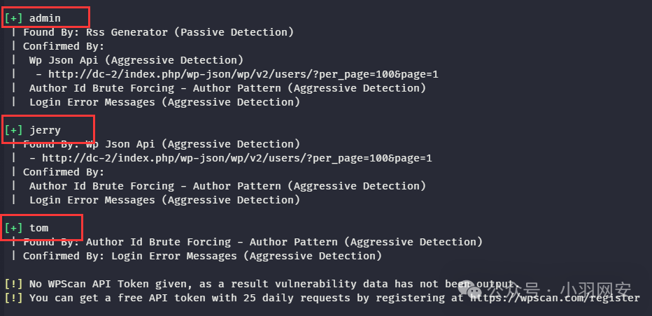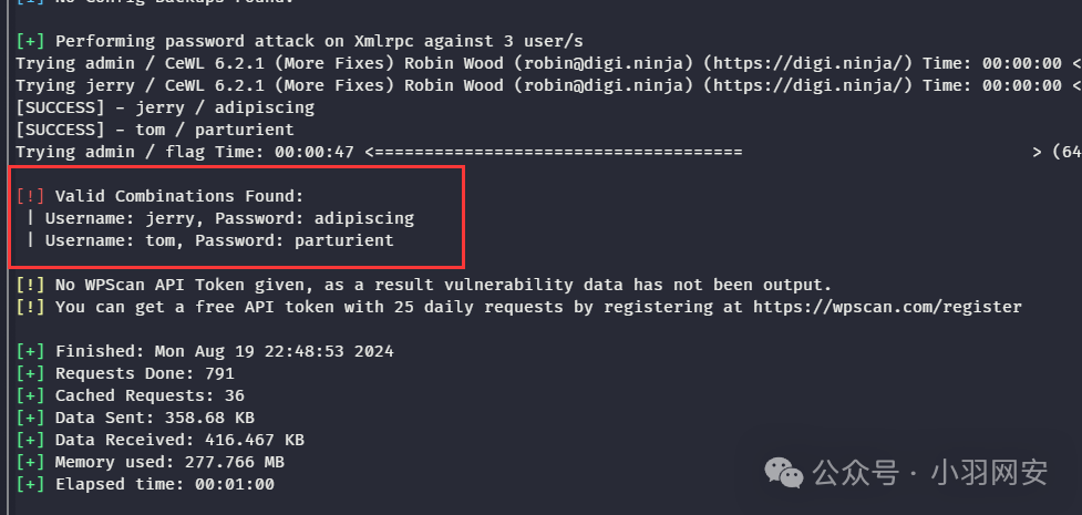 使用wpscan爆破账号密码,指定刚刚我们生成的用户字典users.txt和密码字典passwd.txt