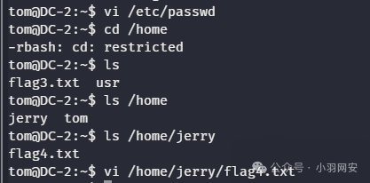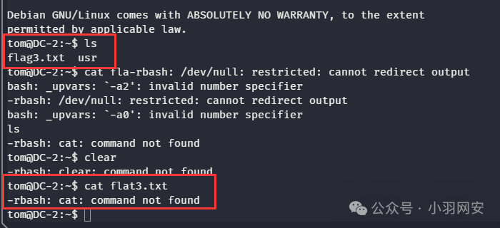 h0ck1r丶羽什么是rbash?它与一般shell的区别在于会限制一些行为,让一些命令无法执行,这里就让我的cat、clear、su等等命令进行了限制