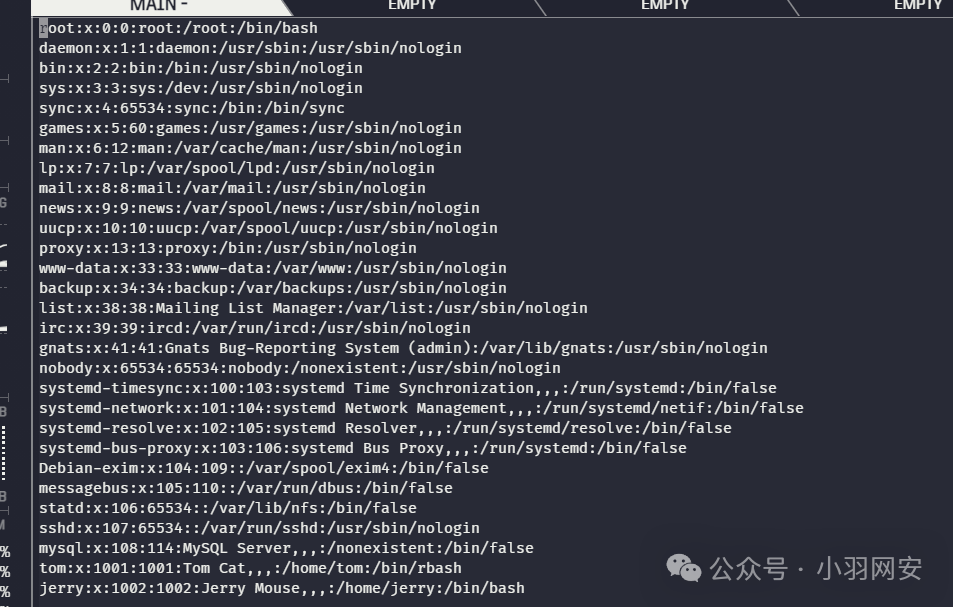 我们去/etc/passwd,看看能不能添加一个”root“用户,看样子不行了,你也可以直接查看这个文件的权限,这里我就不掩饰了