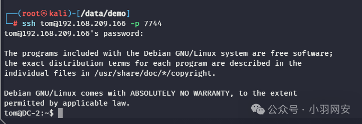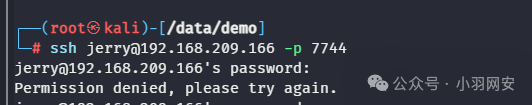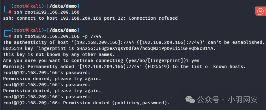 用ssh默认22端口是拒绝服务的,指定一下7744端口的时候既让让我们输入密码,那这个就是ssh服务端口了